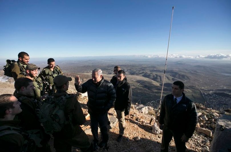 Israel’s Prime Minister Benjamin Netanyahu, center, talks with Israeli soldiers at a military outpost during a visit at Mount Hermon in the Israeli-controlled Golan Heights overlooking the Israel-Syria border on Wednesday, Feb. 4, 2015. (AP Photo/Baz Ratner, Pool)